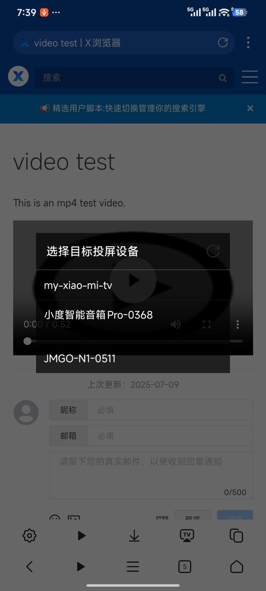X Browser supports the DLNA casting protocol, which is currently the most mainstream casting standard. Basically all smart TVs, TV boxes, and smart projectors support the DLNA protocol, meeting most casting scenarios. For other casting protocols (such as AirPlay), we can also open videos by binding third-party players, then use the casting features of those players.