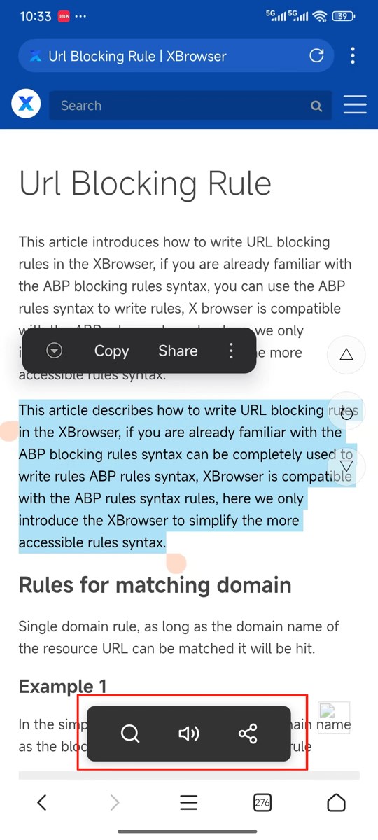 If X Browser is not your system’s default browser, clicking the “Search” button in the system toolbar after selecting text will usually jump to the system’s default browser to search. This script solves this problem: clicking the “Search” button in the floating toolbar will open a new tab in X Browser to search.